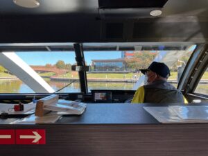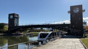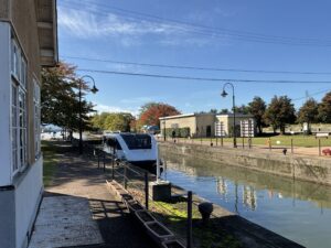 11月上旬の秋晴れの日に富岩運河環水公園の水上ラインの船「fugan」に乗りました。この船はソーラー船でとても静かで水上を滑かに進みます。中島閘門に行き「水のエレベーター」2.5mの高低差を体験しました。パナマ運河方式(前後のゲートを交互に開閉することで水位を二対の扉で調整する)の閘門です。